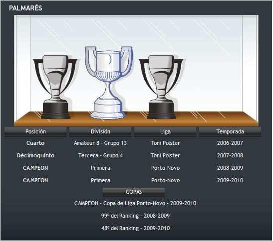 Tan fácil como un pequeño cuadro debajo por temporadas, donde aparezca la posición en liga y la categoría, la ronda a la que se ha llegado en copa, la posición en el ranking, etc. de cada temporada.